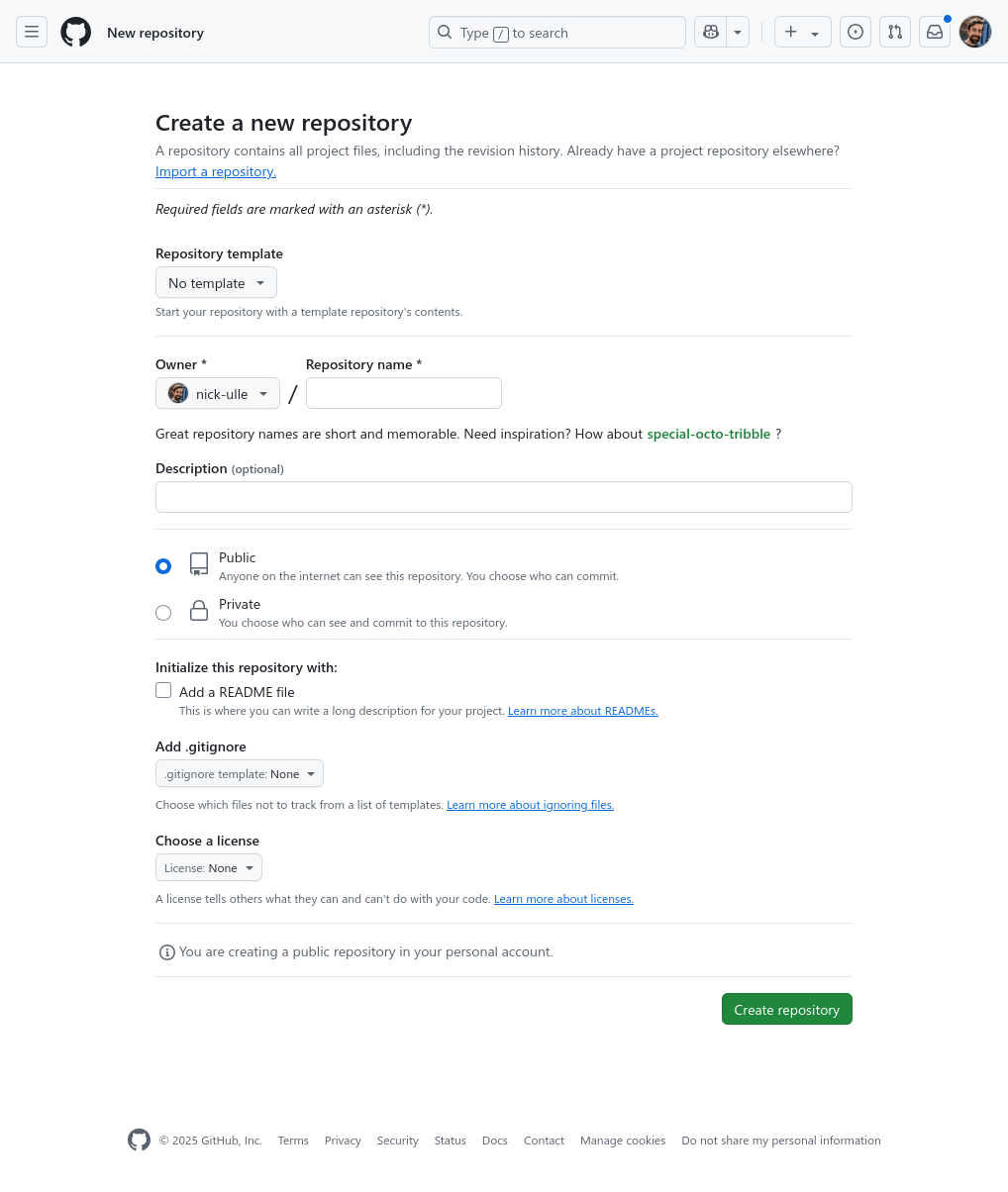 - Whether the repository should be public (viewable by anyone) or private (viewable only by you and those you grant access)