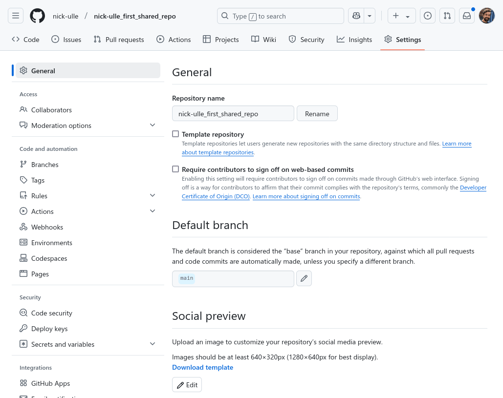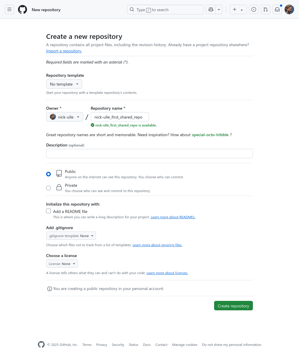 We’ll initialize a new repository to share, but you could also skip this step and follow the rest to share an existing repository. Name the new repository USERNAME_first_shared_repo, where USERNAME is your GitHub username: