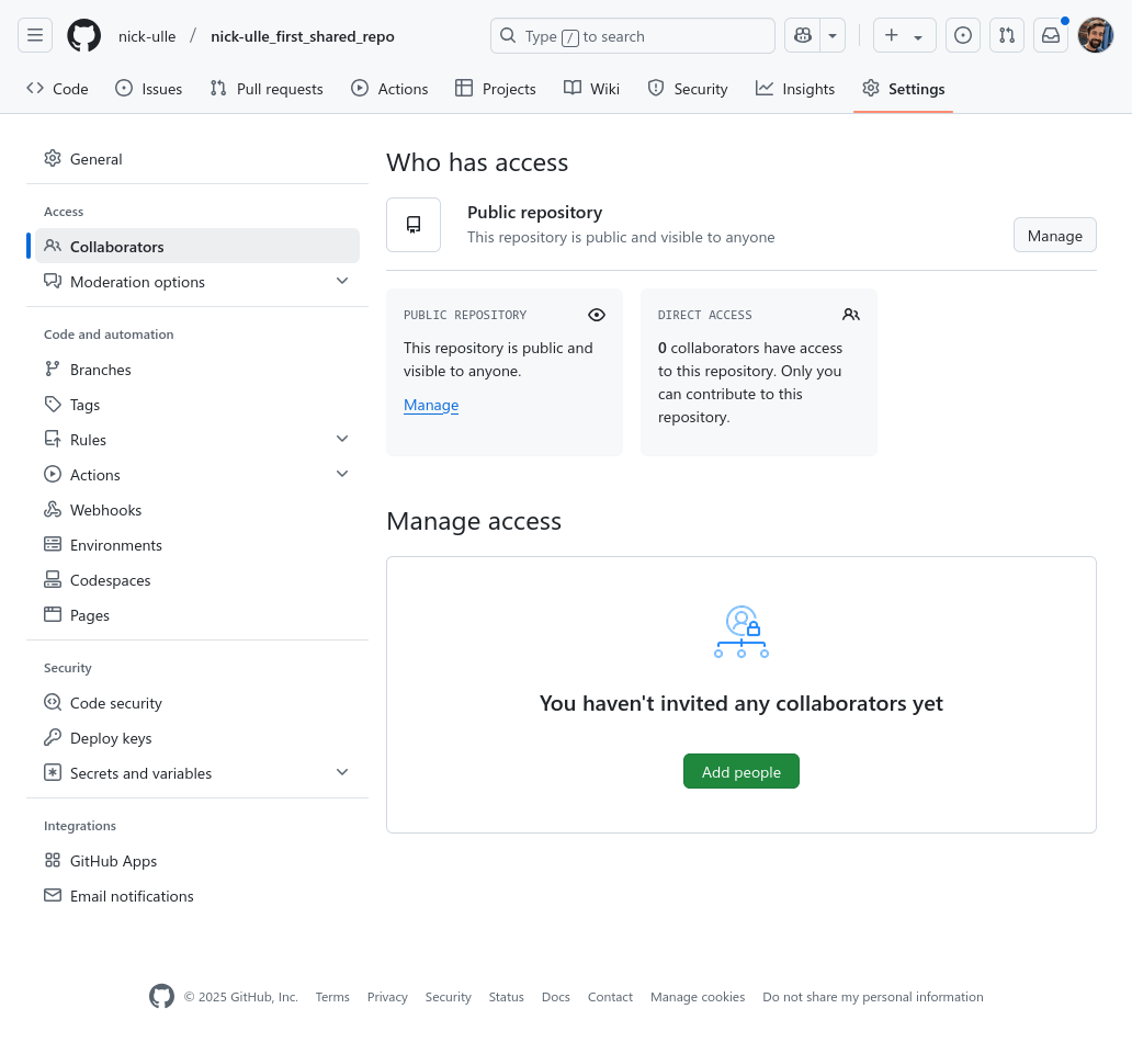 Click on the green “Add people” button near the bottom of the page, then enter your partner’s GitHub username in the popup that appears. Then tell your partner to check their email (the one they used to register with GitHub) for an invitation to collaborate on your repository.