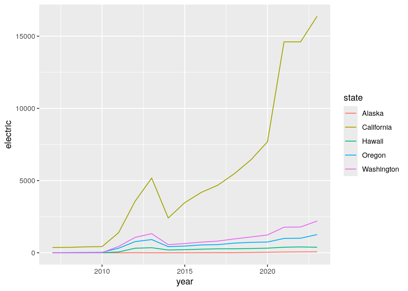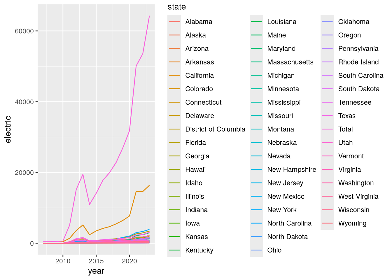 To get started, let’s write code to read and clean the data for 2023, since it’s the last year. We can use the code in read_fuel_sheet as a reference. We’ll still use the readxl package’s read_excel function to read the sheet:
