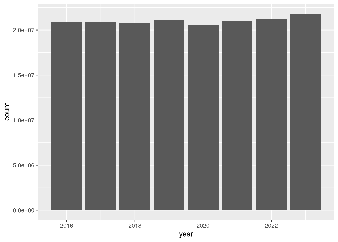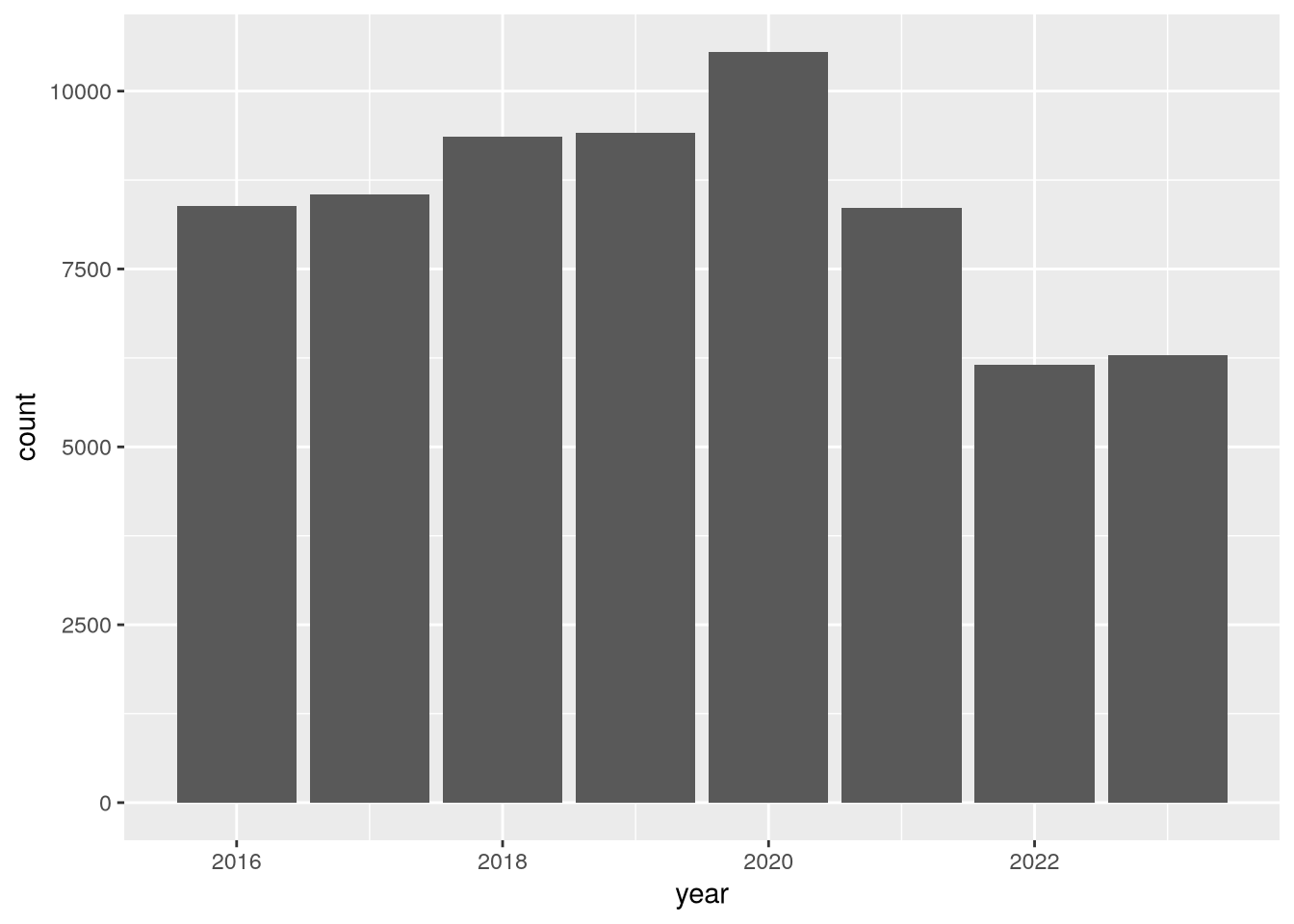 In this plot, there’s a clear uptick in census-days in 2020, and then an interesting decrease to below 2019 levels in the years following. Again, you could use other columns in the dataset to investigate this further. We’ll end this case study here, having accomplished the difficult task of reading the data and the much easier task of doing a cursory preliminary analysis of the data.