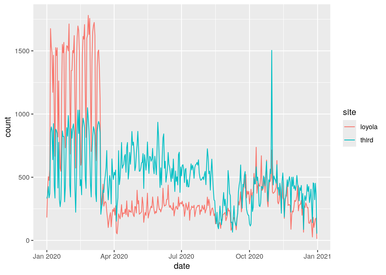 Suppose we want to try to get a better answer to whether Loyola or 3rd tends to be busier. One way we can do it is by making a line plot with the counts for each site over time. This way we’re treating each site as a group within the data and making a comparison between groups.