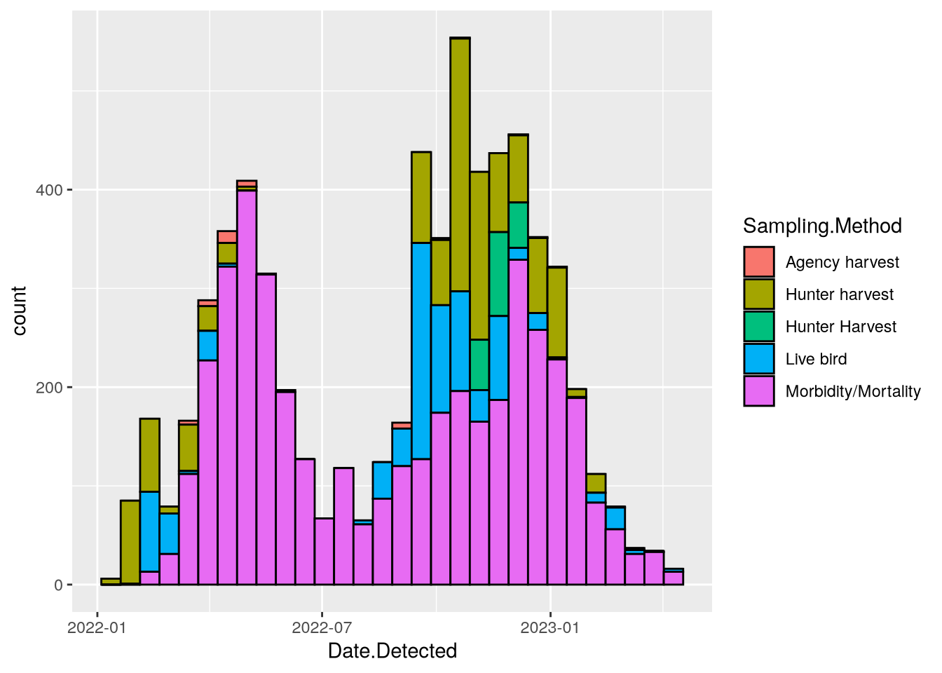 aes(x = Date.Detected, fill = Sampling.Method),