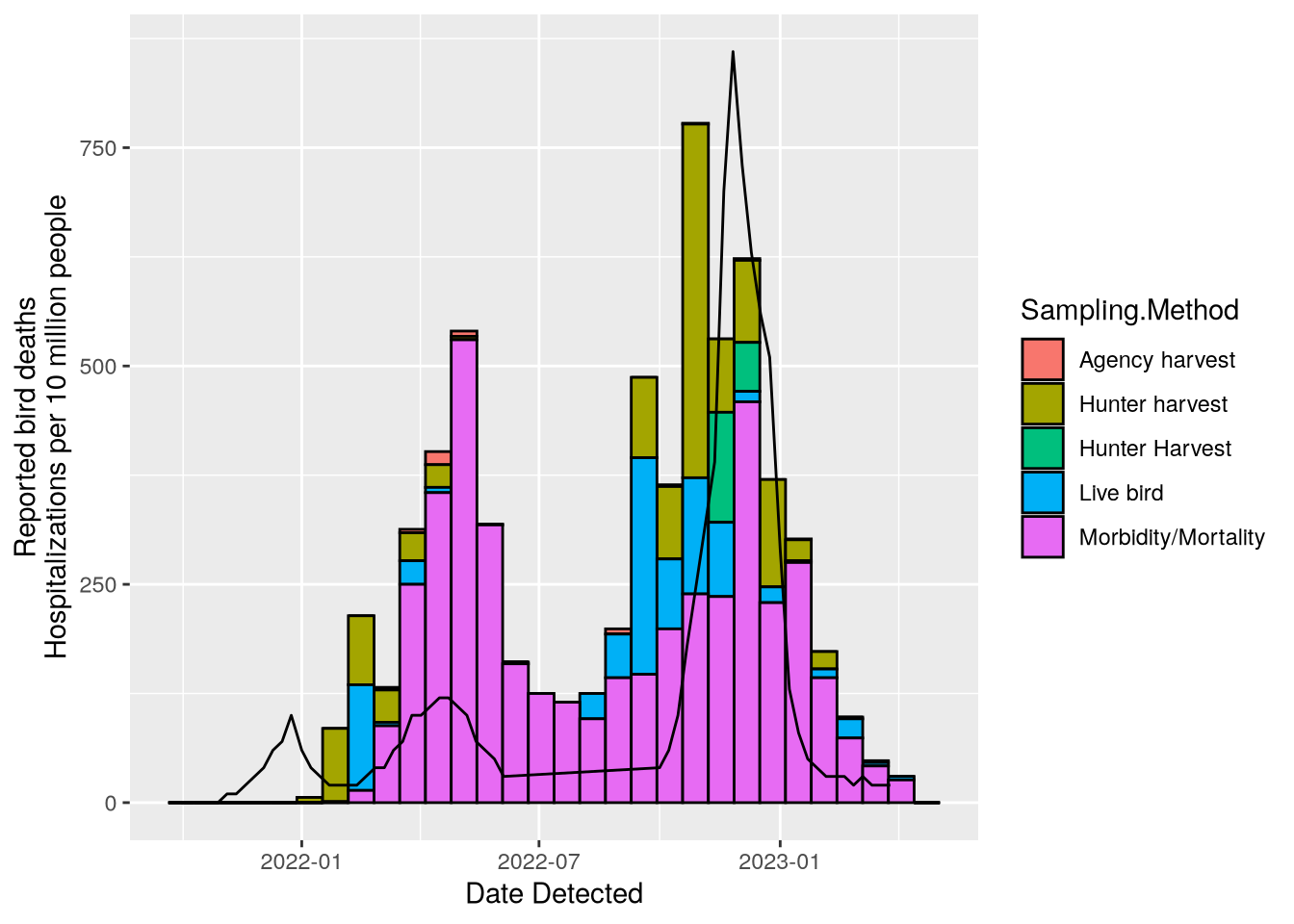 y = "Reported bird deaths\nHospitalizations per 10 million people"