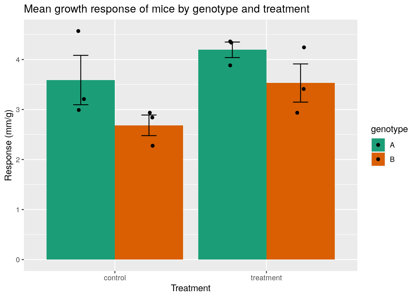 This case study is based on a question that came up in DataLab’s office hours. Suppose you’ve done an experiment to see how mice with two different genotypes respond to two different treatments. Now you want to make a bar plot of the mean response for each group, with error bars indicating the standard deviation of the mean. You also want to show the raw data. I’ve simulated some data for us to use.