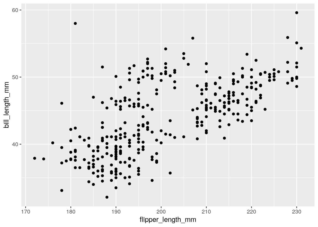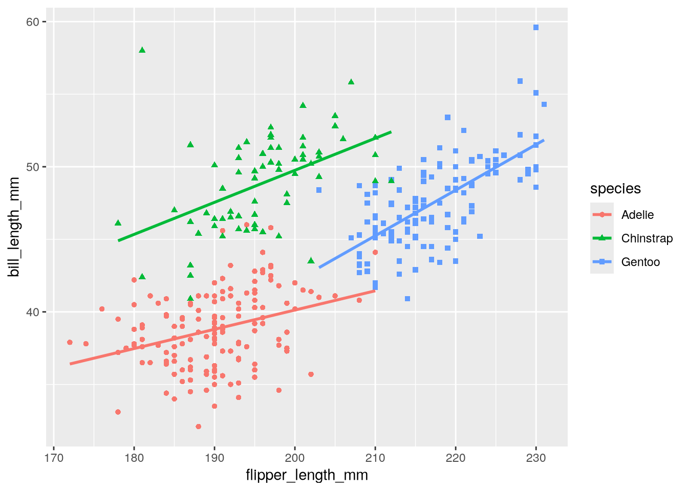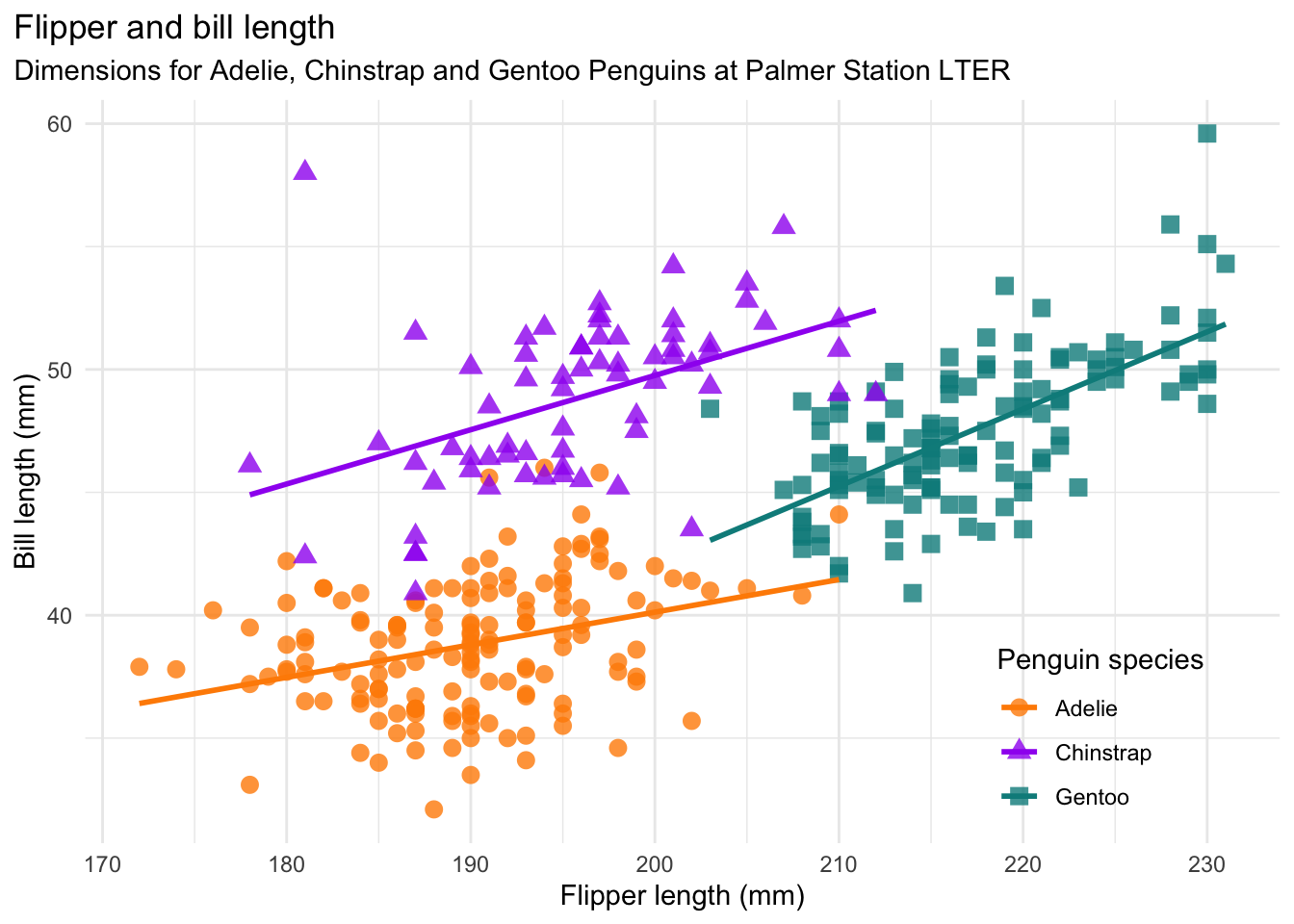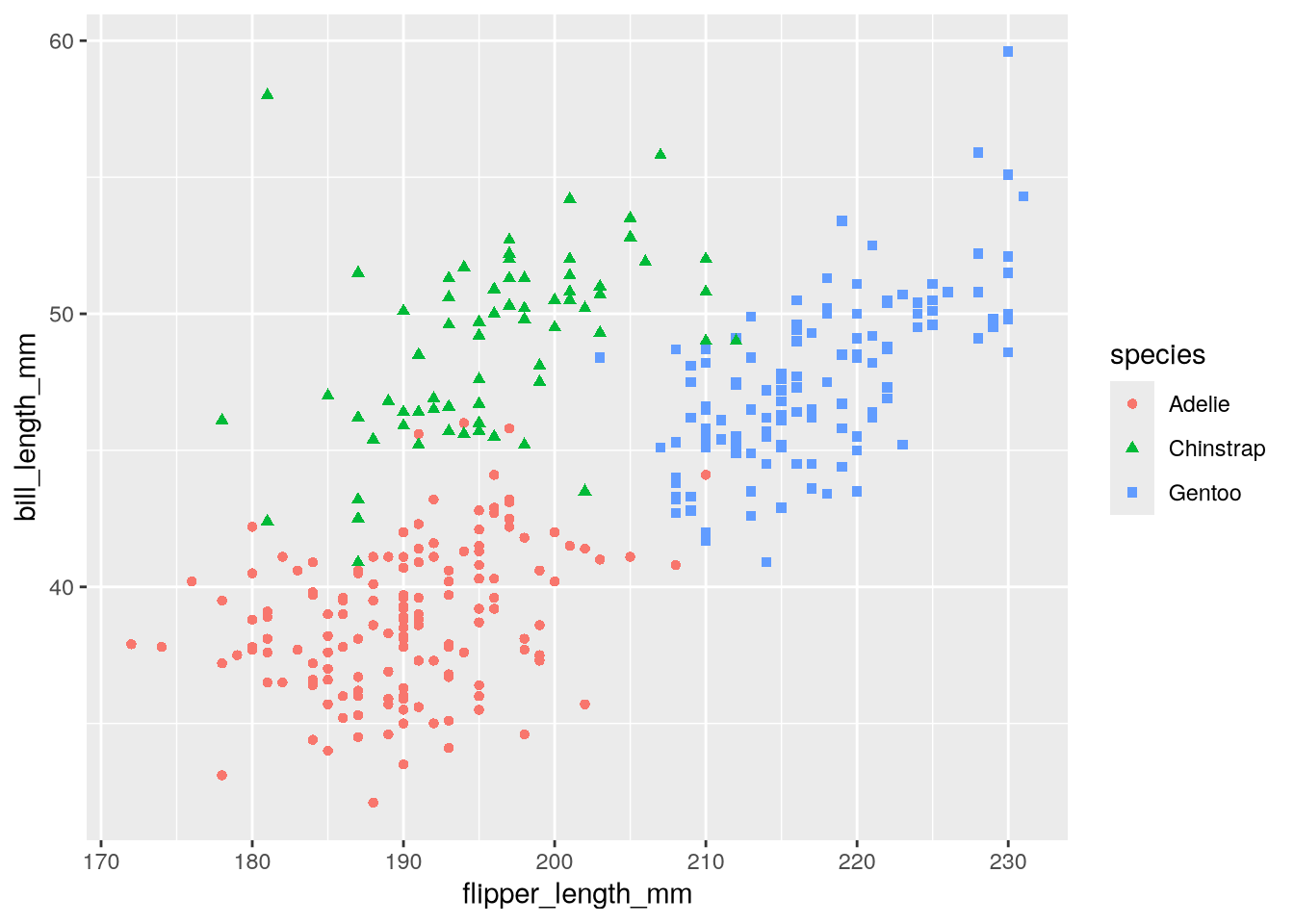 As a refresher about the fundamentals of ggplot2, let’s recreate the scatter plot in Figure 5.2, which shows flipper length versus bill length for hundreds of individual penguins from three different species: Adélie, Chinstrap, and Gentoo.