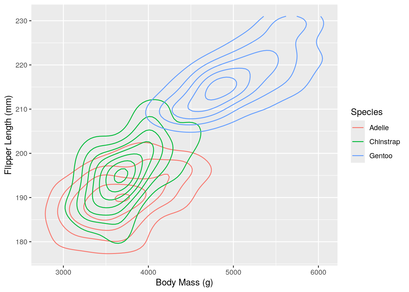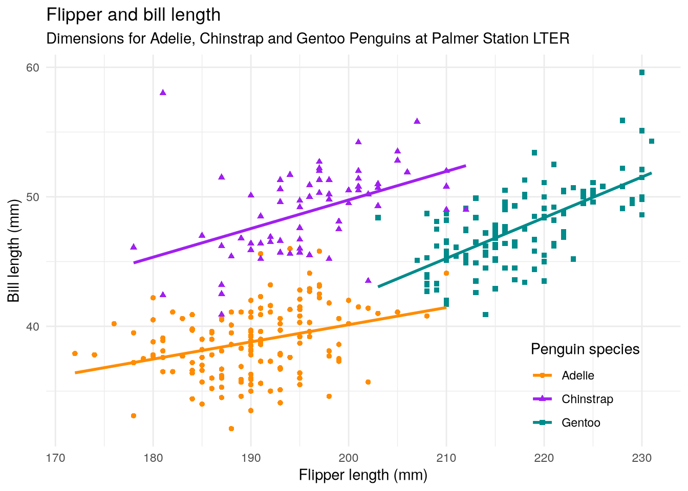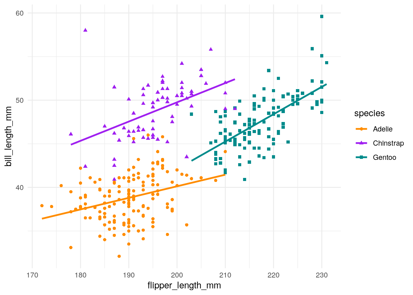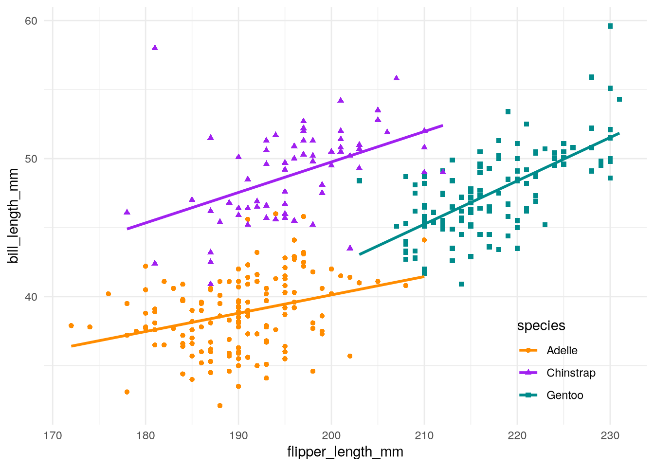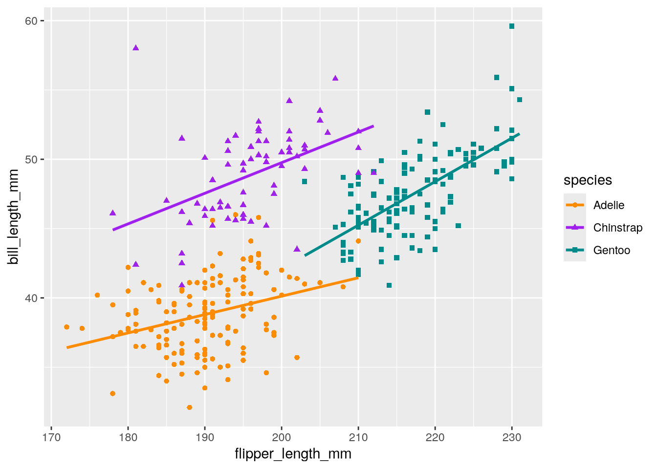 As a refresher about the fundamentals of ggplot2, let’s recreate the scatter plot in Figure 5.2, which shows flipper length versus bill length for hundreds of individual penguins from three different species: Adélie, Chinstrap, and Gentoo.