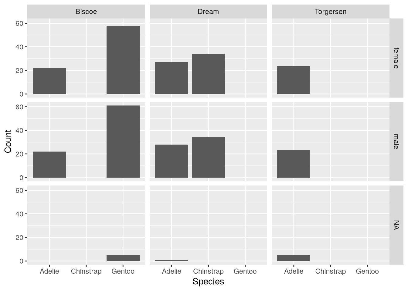 The penguins data appears to satisfy all three, which isn’t surprising since this dataset is packaged for others to use. If there was a structural problem, we would need to reshape the data (see Section 3.1).
