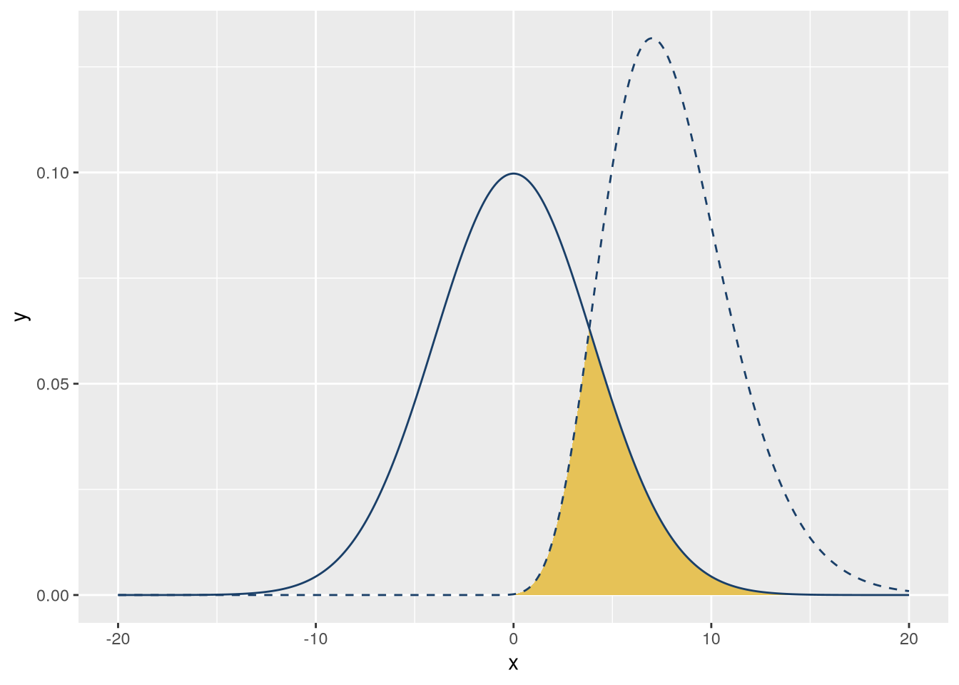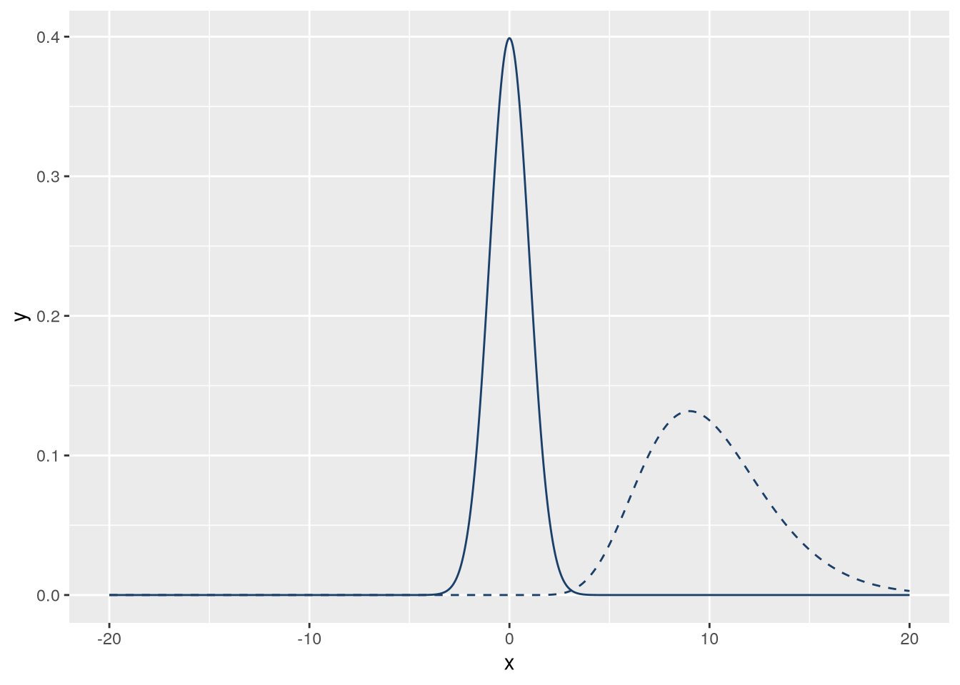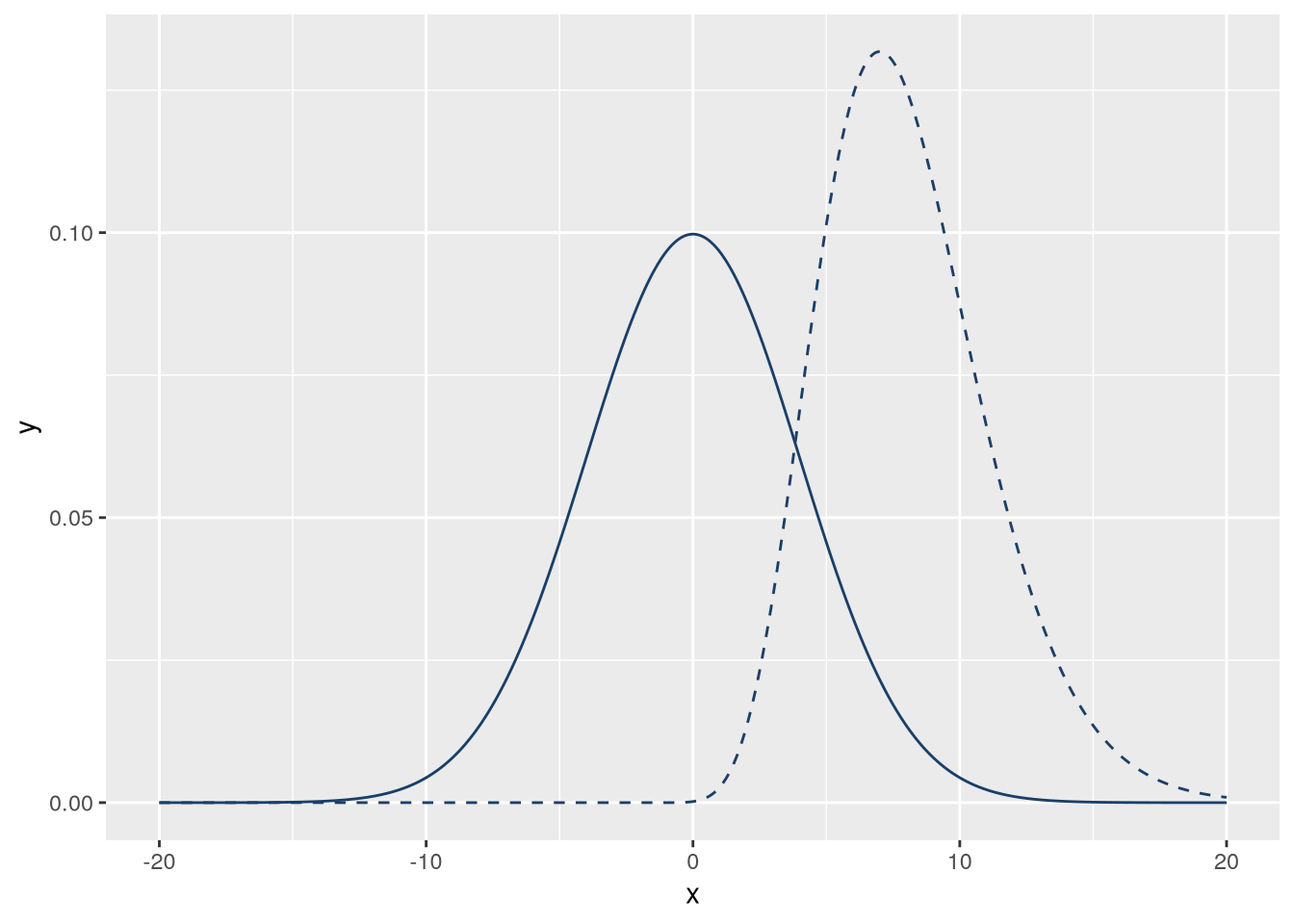 f_gamma = \(x) dgamma(x, 10)We can use ggplot2’s geom_function geometry to plot functions. This geometry will automatically evaluate the function at many points over an interval. We’ll use 1,000 points in the interval \((-20, 20)\). We’ll also set linetype = "dashed" on one of the lines so that they’re distinct. The code to make the plot is:
