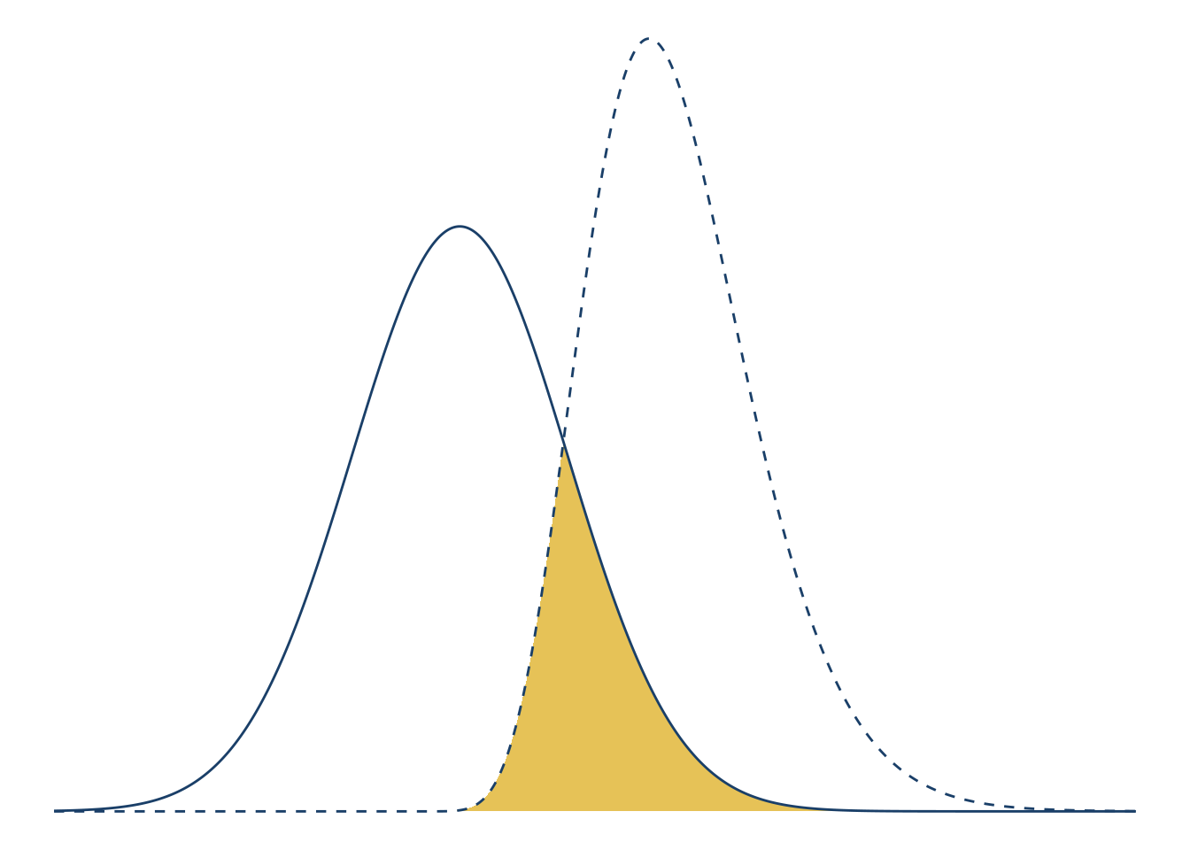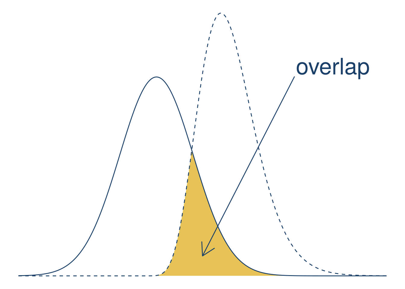 Plotting a curve or function can make it much easier to understand and explain its behavior. For this case study, suppose you want to make a visualization that shows how the area of overlap between two different probability density functions is a measure of how similar they are. They should have some overlap, but not too much. The color palette should be UC blue (#1a3f68) and gold (#e6c257) to match the rest of your presentation.