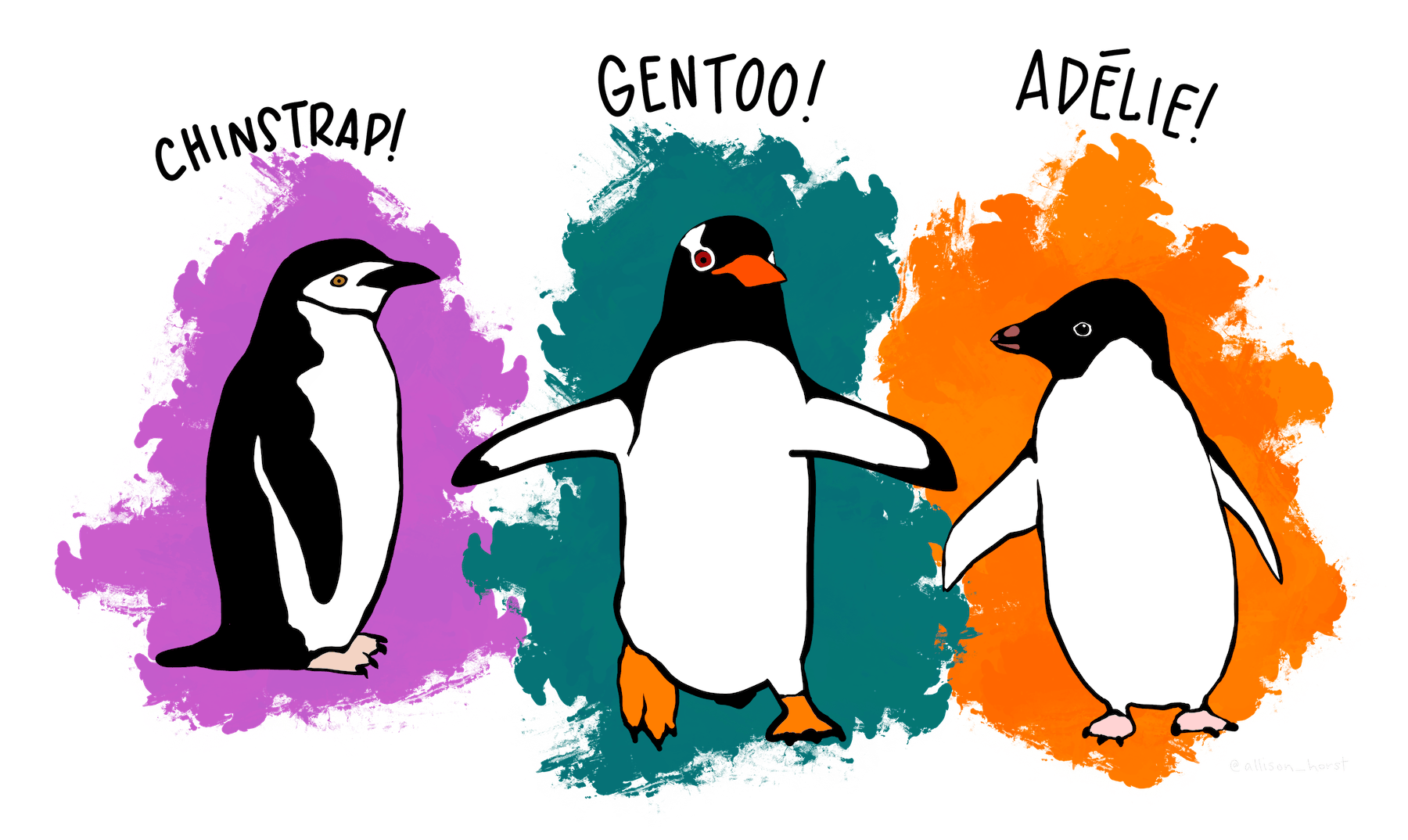 The scatter plot uses the Palmer Penguins dataset, which was collected by Dr. Kristen Gorman at Palmer Station, Antarctica. The plot was created by Alison Horst, who also packaged the data for public use. The package is called palmerpenguins; install it now if you didn’t earlier.