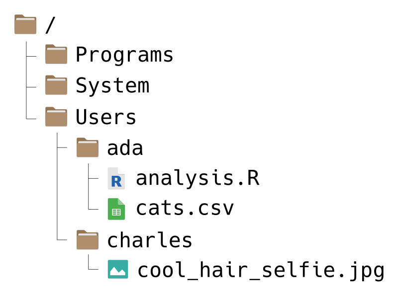 Your computer’s file system consists of files (chunks of data) and directories (or “folders”) that organize those files. For instance, the file system on a computer shared by Ada and Charles, two pioneers of computing, might look like this: