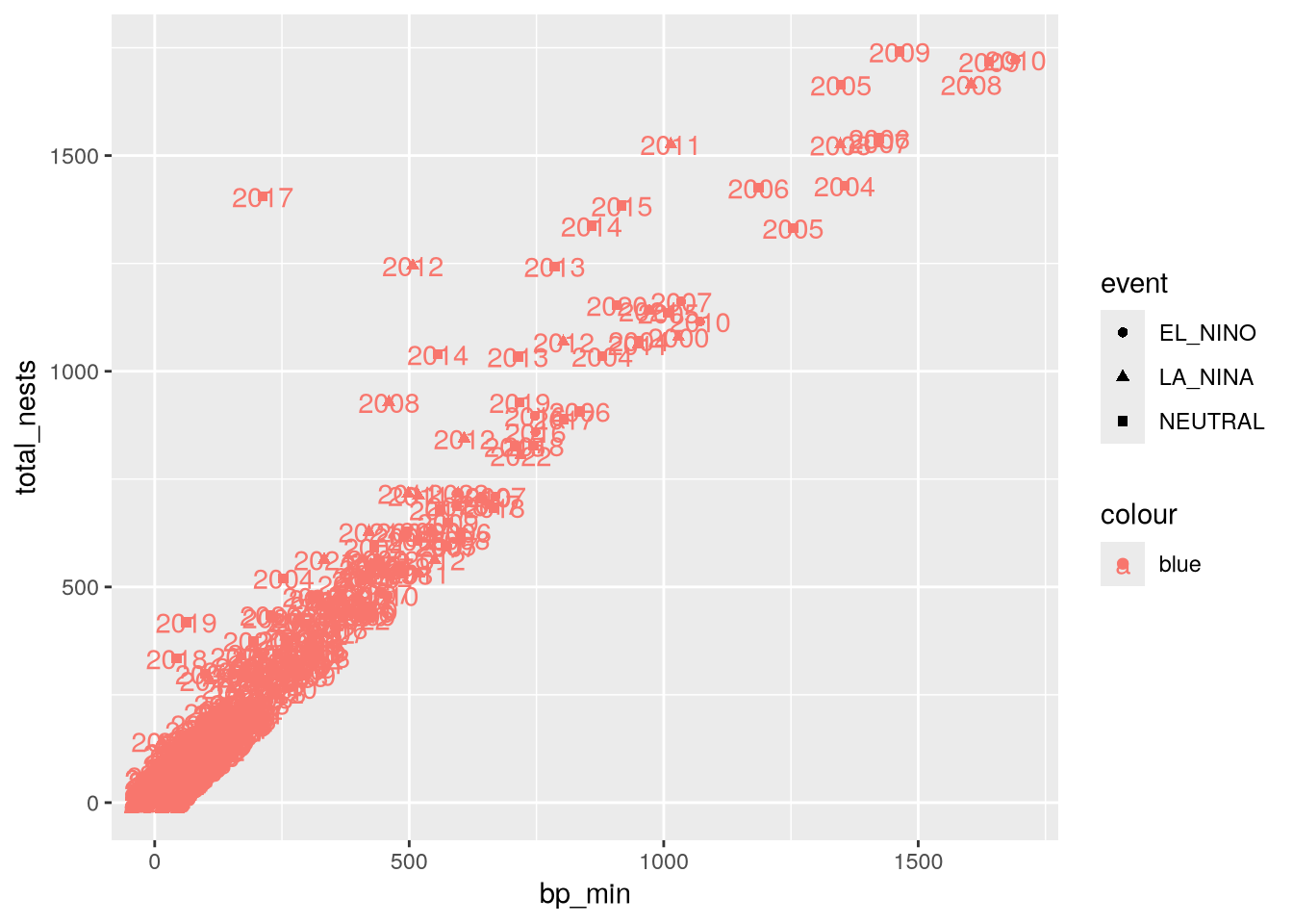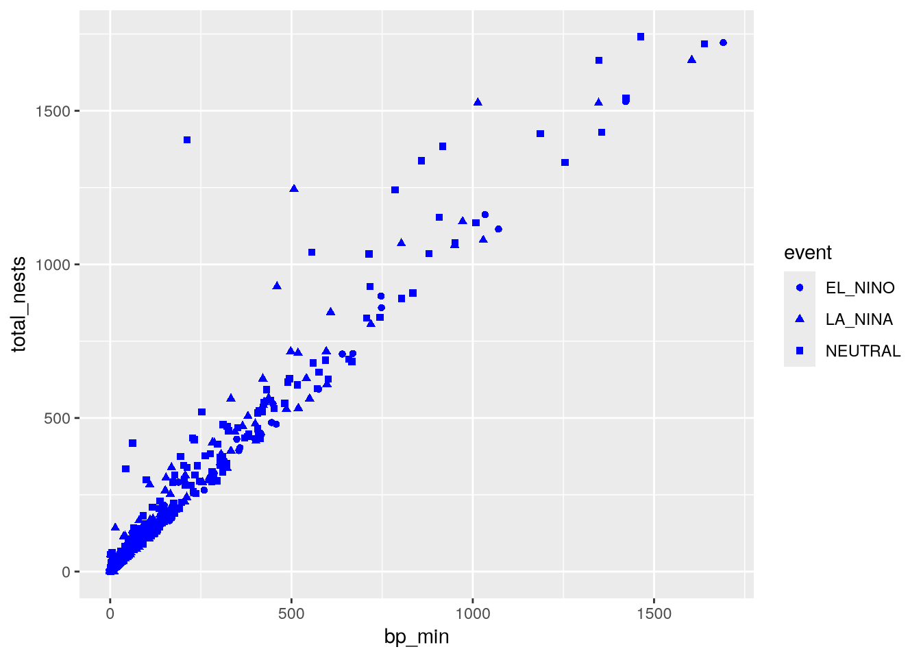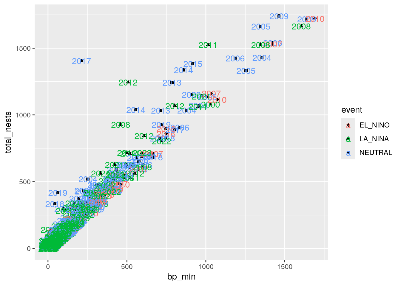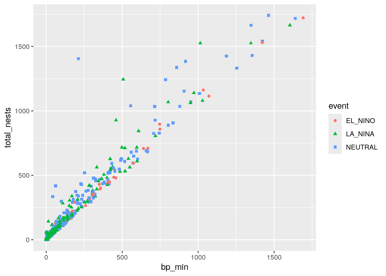 aes(x = bp_min, y = total_nests, color = event, shape = event) +