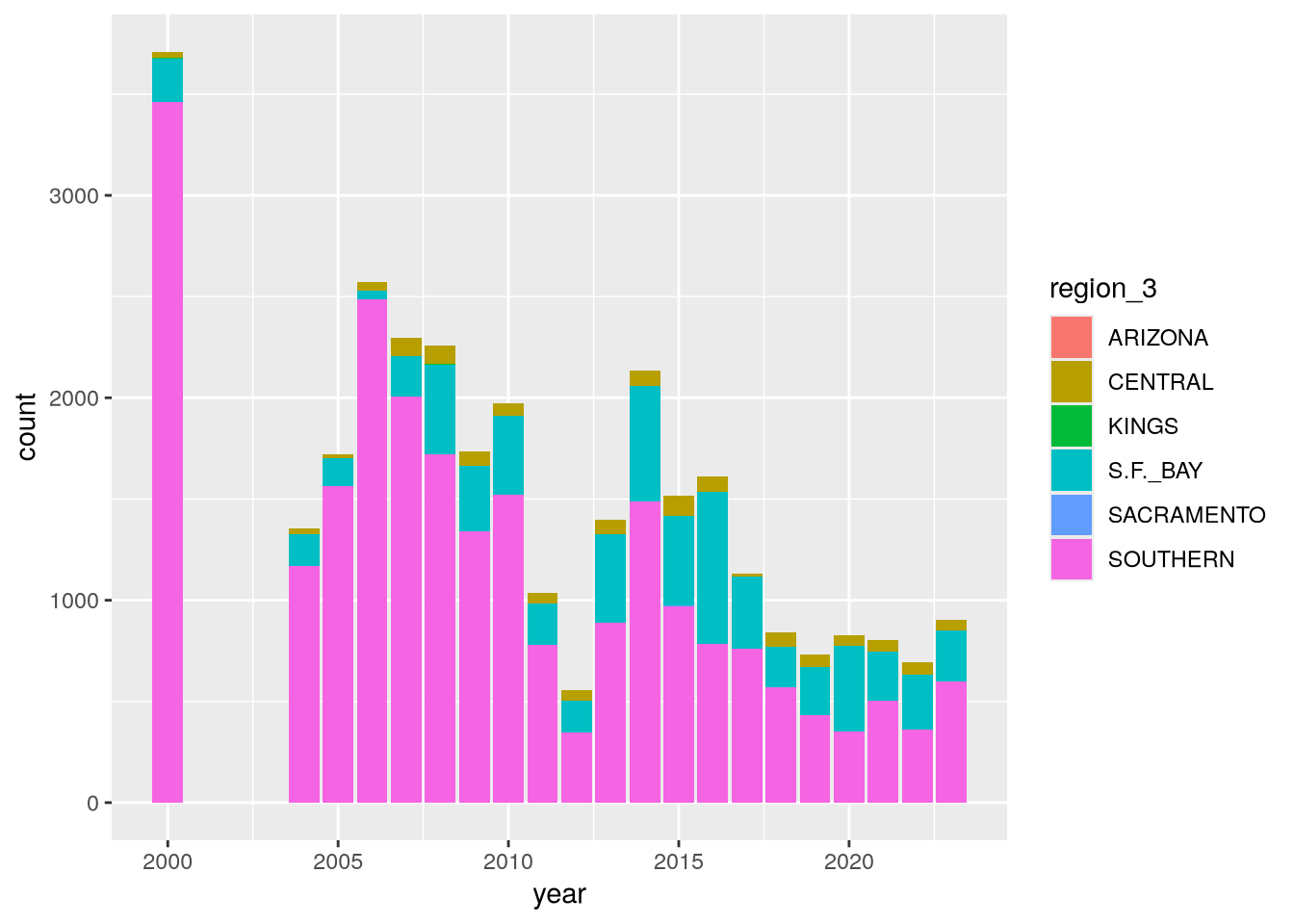 The plot reveals that there are a few extraneous categories in the region_3 column: ARIZONA, KINGS, and SACRAMENTO. These might or might not be erroneous—and it would be good to investigate—but they don’t add anything to this plot, so let’s exclude them.