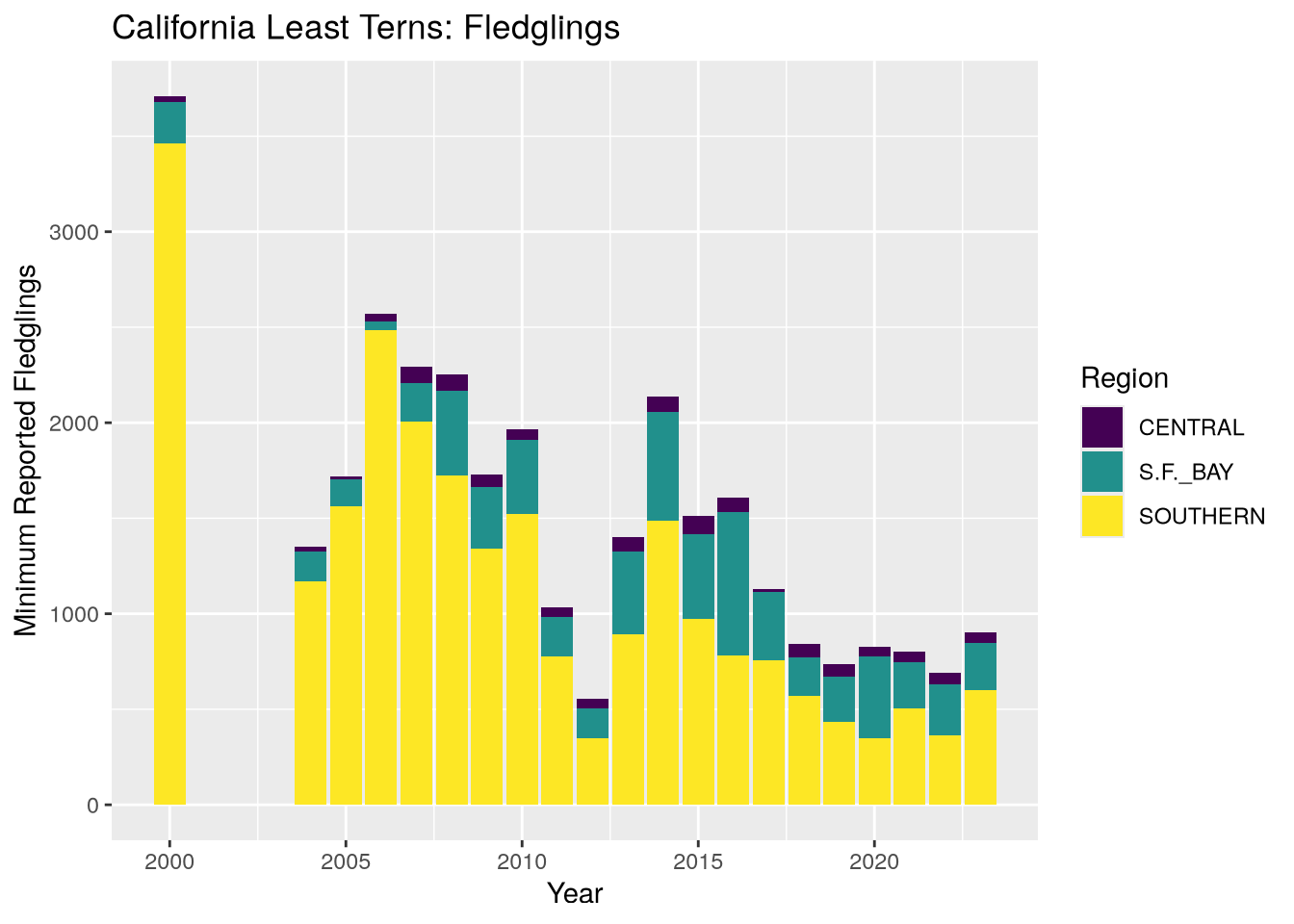 Suppose we want to visualize how many fledglings there are each year, further broken down by region. A bar plot is one appropriate way to represent this visually.