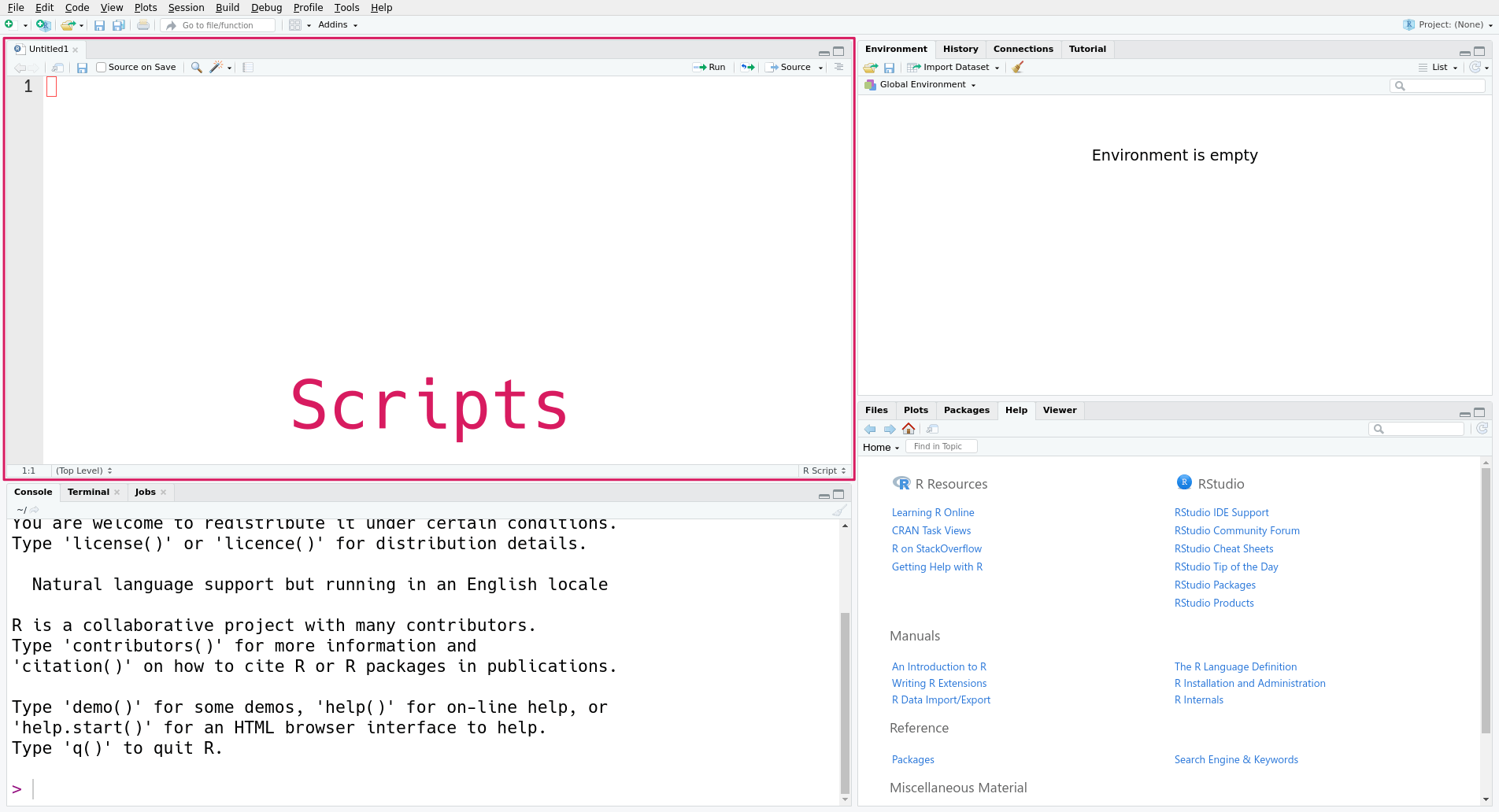 The new pane is the scripts pane, which displays all of the R scripts you’re editing. Each script appears in a separate tab. In the screenshot, only one script, the new script, is open.