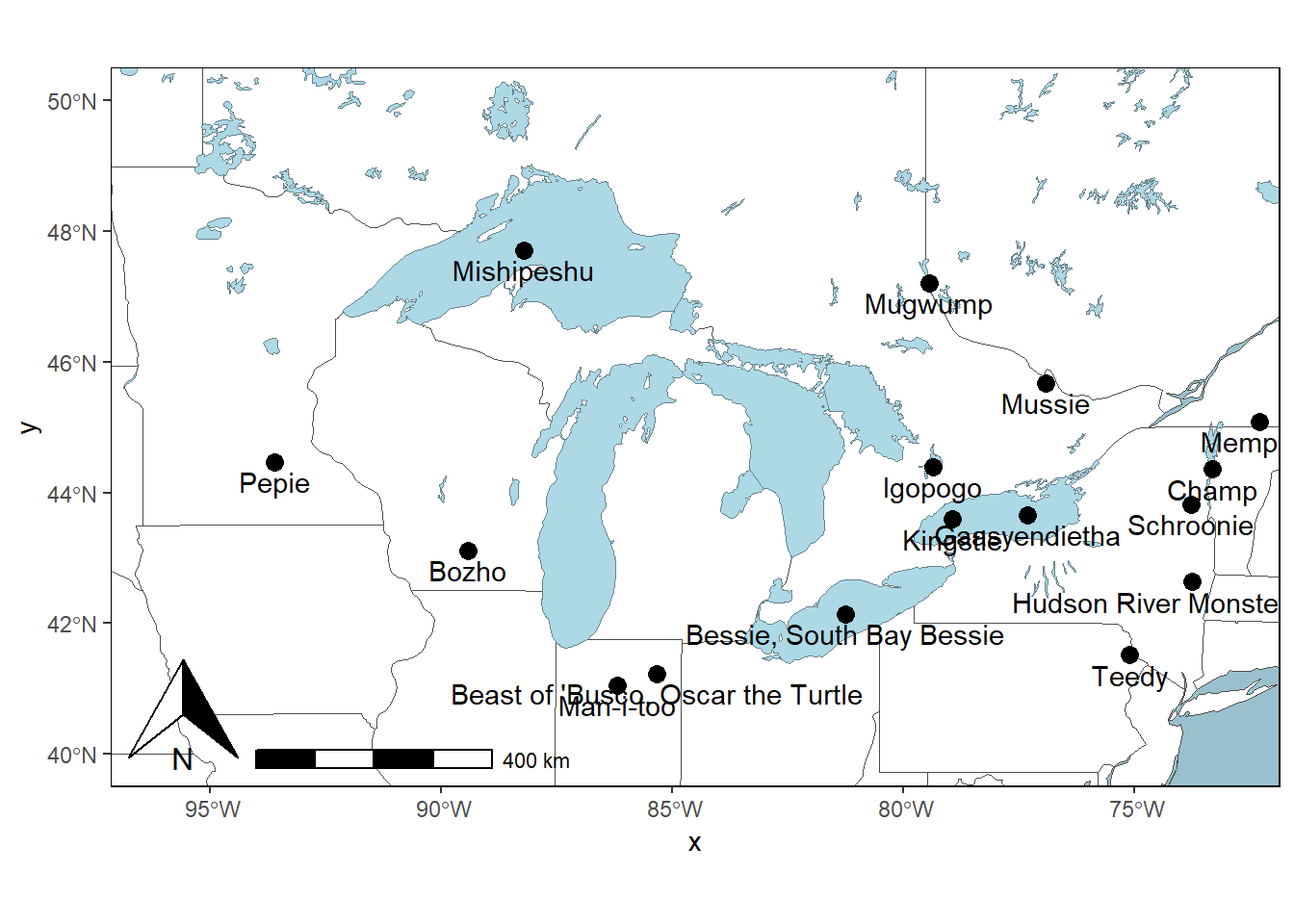 geom_sf_text(data=monsters, aes(label = Name), nudge_y = -.3) #add the label text and nudge them down so the letters aren't on top of the pointWarning in st_point_on_surface.sfc(sf::st_zm(x)): st_point_on_surface may not
